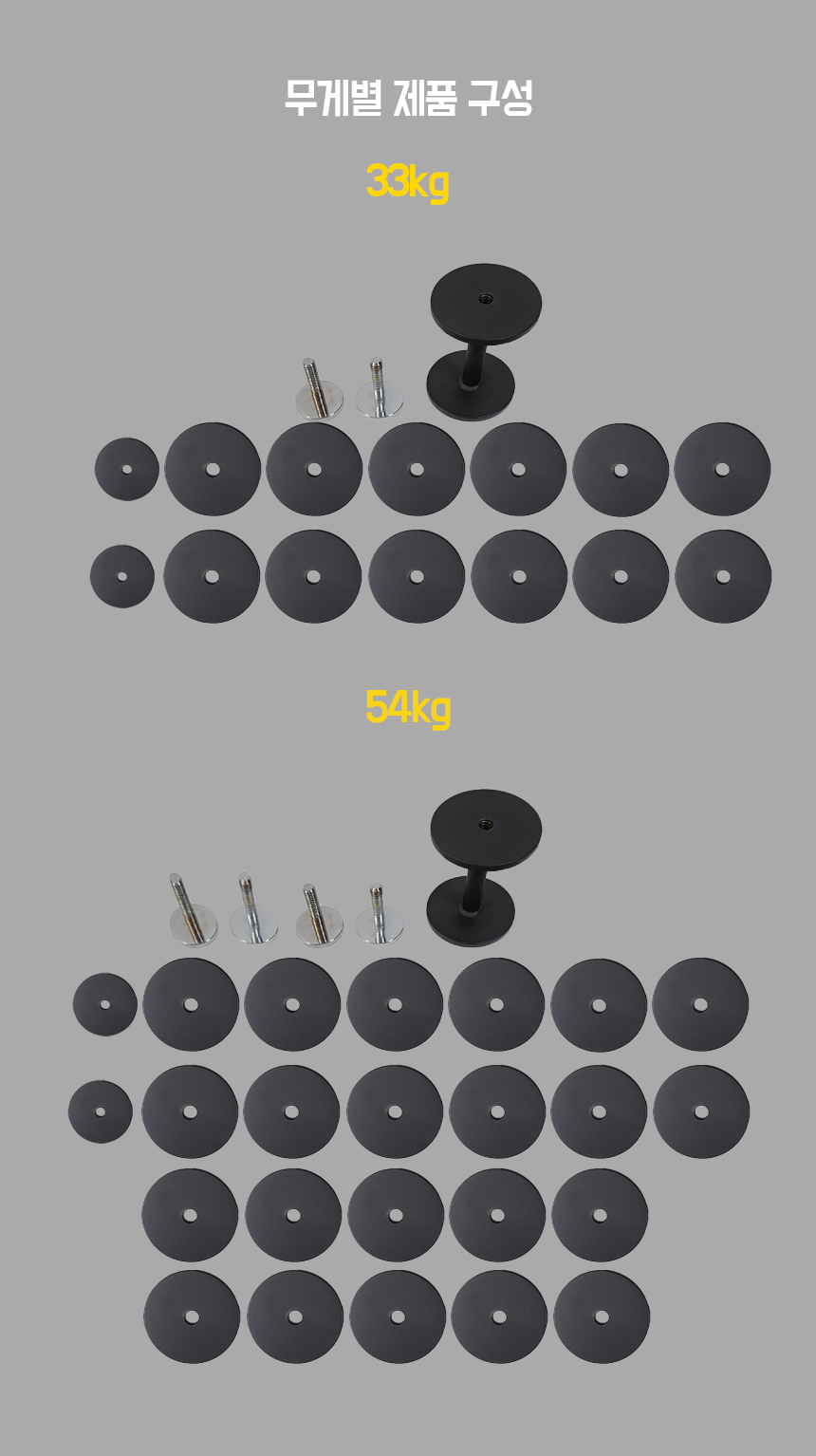 ##[54kg 구성] - 손잡이 1개, 1kg 원판 2개, 2kg 원판 22개, 대구경 짧은 나사 2개, 대구경 긴나사 나사 2개